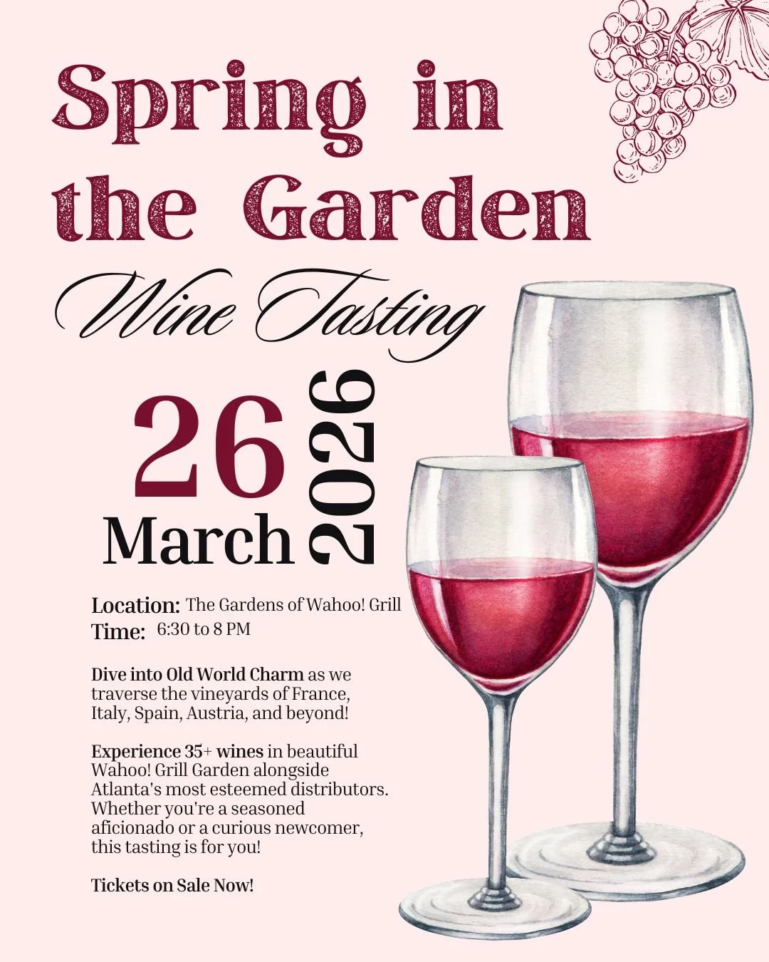 Join us on Thursday, March 26th, from 6:30 - 8:00 pm in Wahoo!’s Private Garden for a night full of our favorite spring sips. You can expect 35+ wines poured by Atlanta's most esteemed distributors, so be sure to reserve your spot now— this event is sure to sell out!